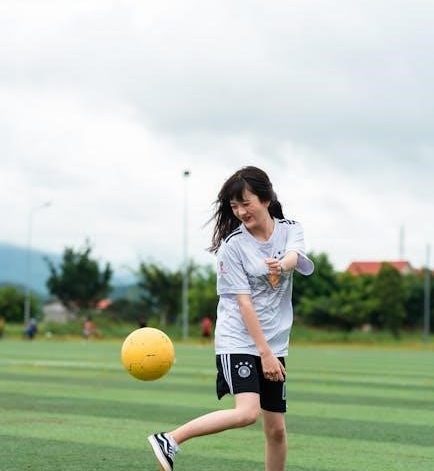 Dribbling and ball control are foundational skills in soccer, and off-season training is ideal for refinement․ Players engage in cone drills, ladder exercises, and figure-eight runs to improve agility and precision․ Stationary ball control exercises, such as toe taps and inside-outside cuts, enhance close-range maneuverability․ Small-sided games and 1v1 challenges encourage creativity and decision-making under pressure․ Coaches often incorporate video analysis to provide feedback and identify areas for improvement․ Consistent practice of these drills builds confidence and mastery, allowing players to dominate possession during the season․ Incorporating variations in speed and direction further enhances effectiveness, ensuring players are prepared for any scenario on the field․